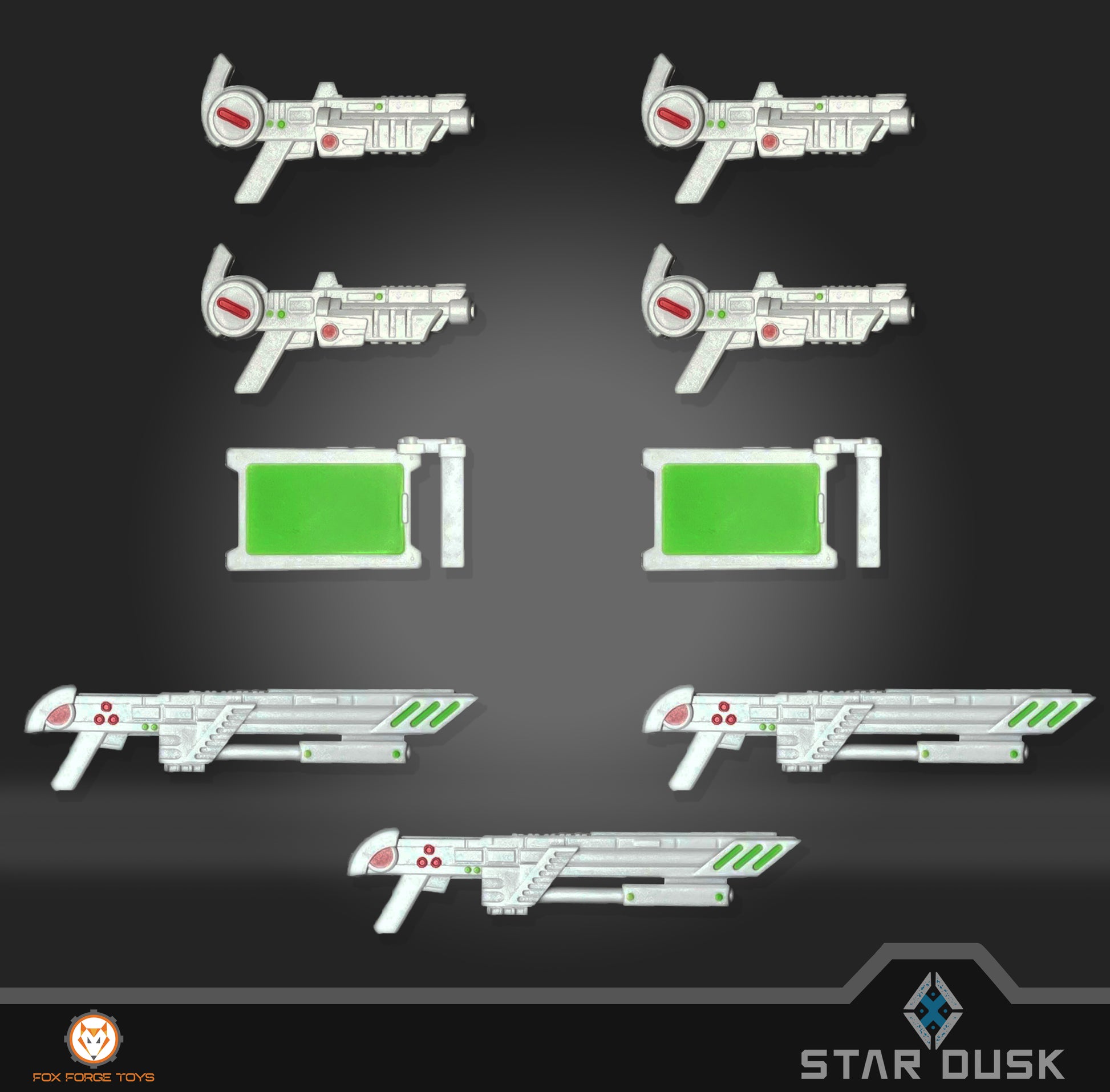 Fox Forge Toys brings you the Accessories Pack Set 1 as part of the Star Dusk action figure line. The Weapons / Accessories Pack Set 1 features four blasters, two tablets, and three rifles for a total of nine items.